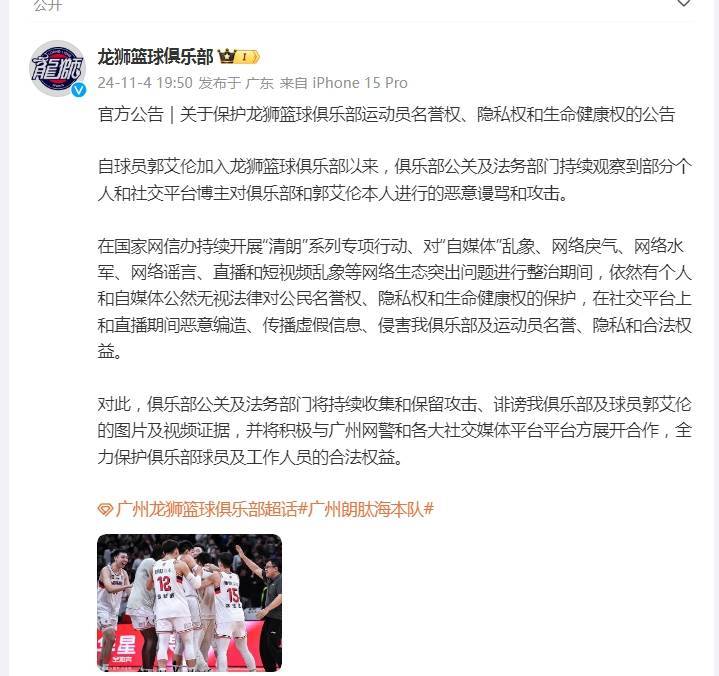 自球员郭艾伦加入龙狮篮球俱乐部以来,俱乐部公关及法务部门持续观察到部分个人和社交平台博主对俱乐部和郭艾伦本人进行的恶意谩骂和攻击。