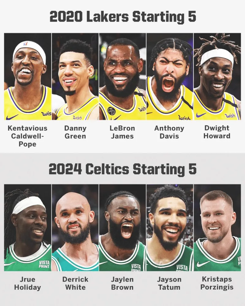 07月31日讯 今日,美媒SportsCenter更新动态,晒出了湖人20年夺冠阵容和凯尔特人24年夺冠阵容对比,并配文: