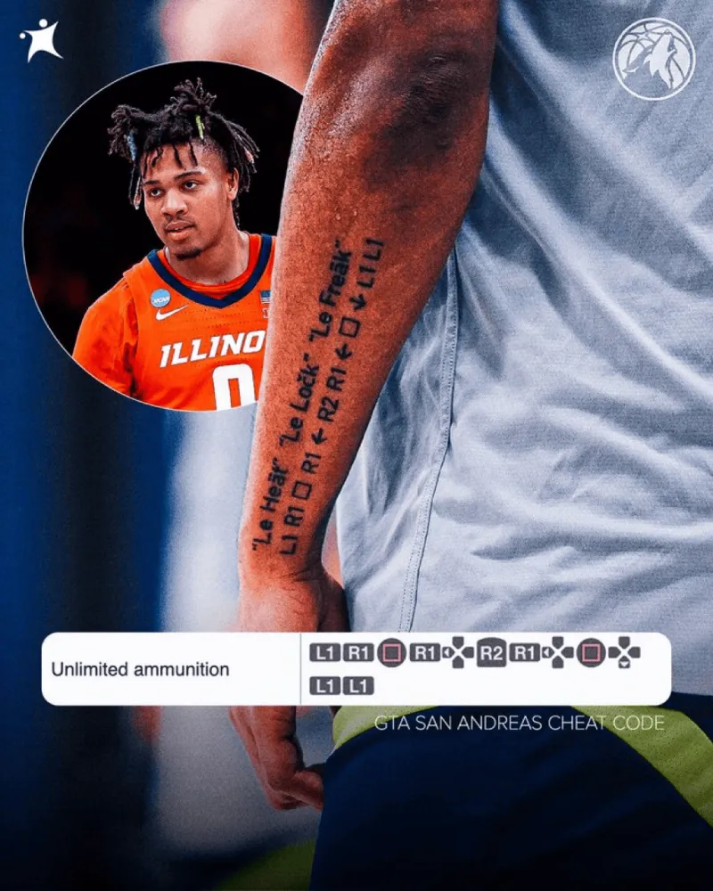7月14日讯今日,据美媒Legion Hoops报道,森林狼新秀特伦斯·香农(Terrence Shannon Jr.)手上纹有GTA(侠盗猎车手)游戏中的无限弹药按钮。