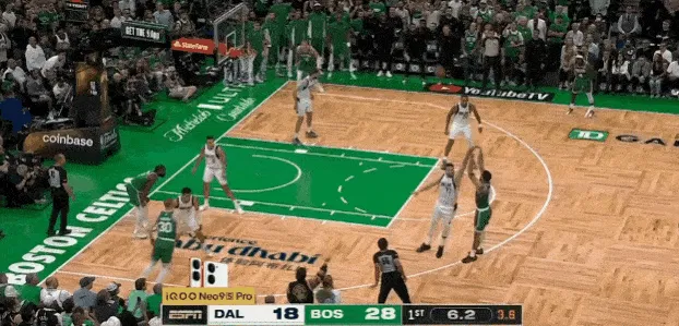 总决赛第五场,首节塔图姆急停三分不中后,独行侠队在还剩4秒时抢下篮板,但独行侠队放弃了进攻;