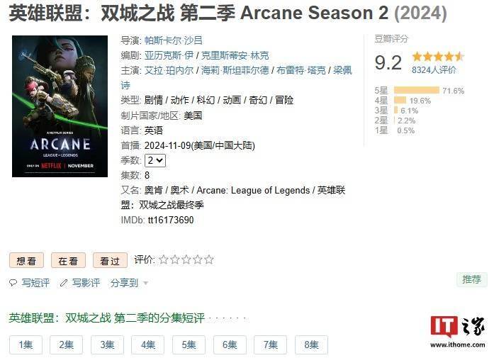 IT之家 11 月 11 日消息,动画剧集《英雄联盟:双城之战》第二季已于 11 月 9 日开播,剧集在腾讯视频、B站连载,豆瓣开分 9.2。