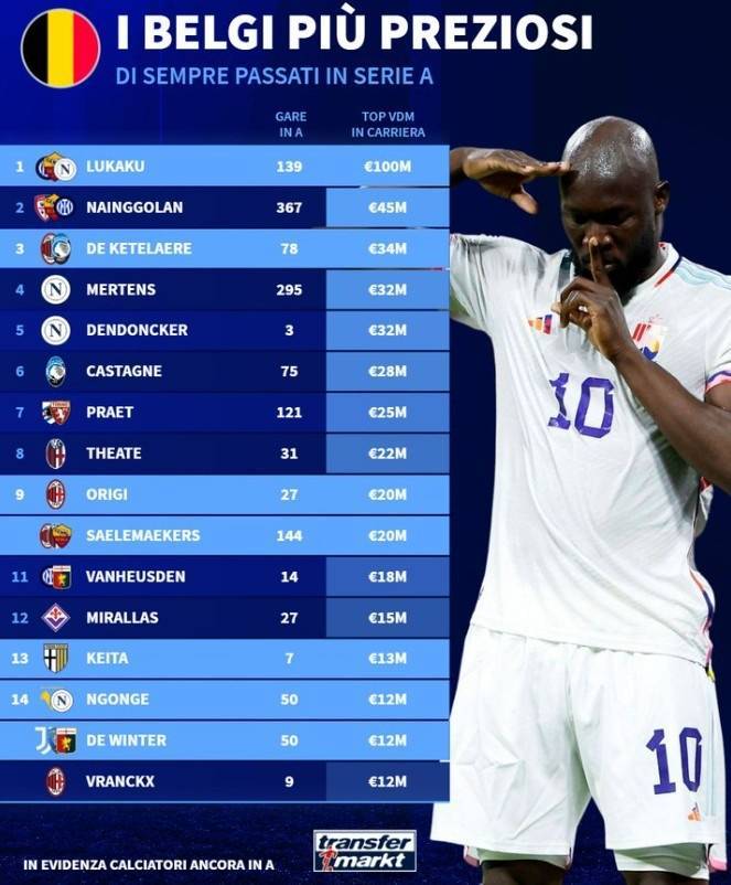 意甲历史身价最高比利时球员排行:卢卡库1亿欧断层领先
