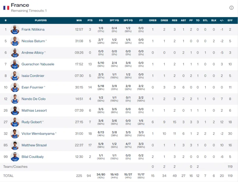 法国:文班亚马18分11篮板6助攻2抢断2盖帽、戈贝尔7分15篮板3助攻2盖帽、富尼耶14分3篮板6助攻、斯特拉泽尔17分3助攻、亚布塞莱13分2篮板
