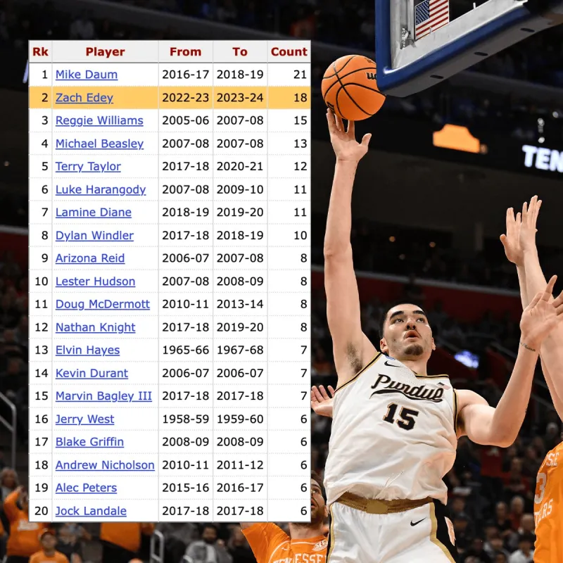2023-24 NCAA赛季,普渡大学的扎克·伊迪在场均32分钟的上场时间里得到25.2分、12.2个篮板、0.3次抢断和2.2次盖帽,投篮命中率62.3%,三分命中率50%。他的场均得分在NCAA中排名第一。第一的。