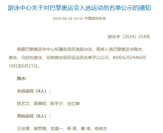 6月18日下午,国家体育总局游泳管理中心发布消息,公布了跳水、游泳、马拉松游泳、花样游泳项目入选巴黎奥运会的运动员名单。