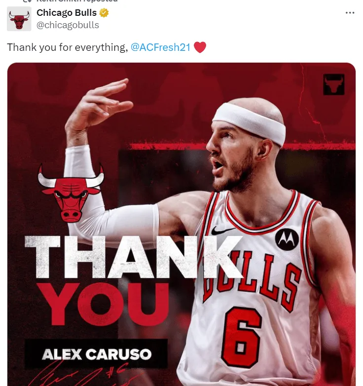 刚刚,公牛队官方晒出了一张照片,感谢卡鲁索,欢迎吉迪。