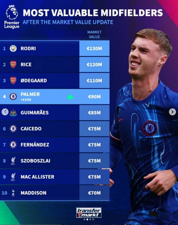 北京时间10月4日,在英超球员身价更新后,德国《转会市场》给出了英超中场身价榜单: