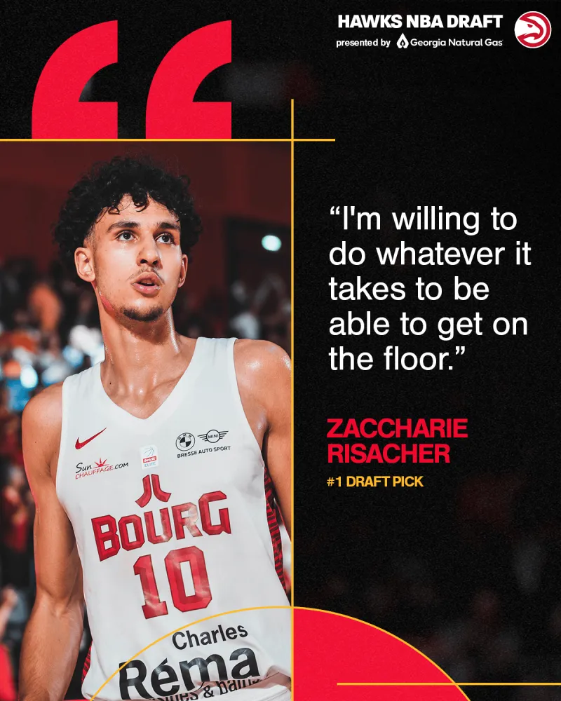 6月27日消息:2024年NBA选秀大会上,老鹰队以第一顺位选中了扎克里·丽莎什。